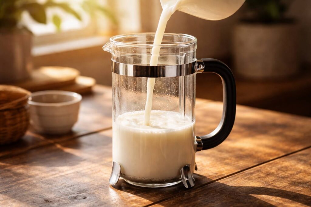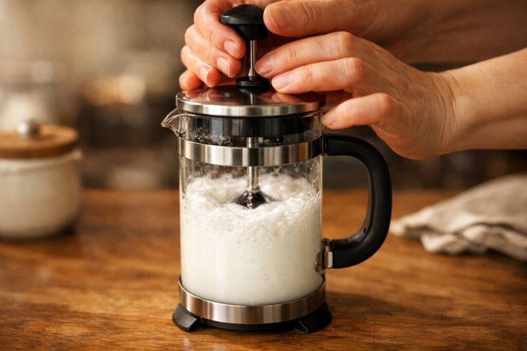 - The Pumping Action (Ini Rahasianya)Tutup French press, tapi jangan di-lock. Plunger di tengah aja. Gerakkan naik-turun dengan cepat dan pendek, sekitar 20-30 kali. Dorongannya cuma 2-3 cm. Kamu bakal ngerasa resistance-nya berubah. Awalnya gampang, lama-lama makin berat. Berhenti pas susu mengembang 1,5x lipat dan terasa lebih kental.